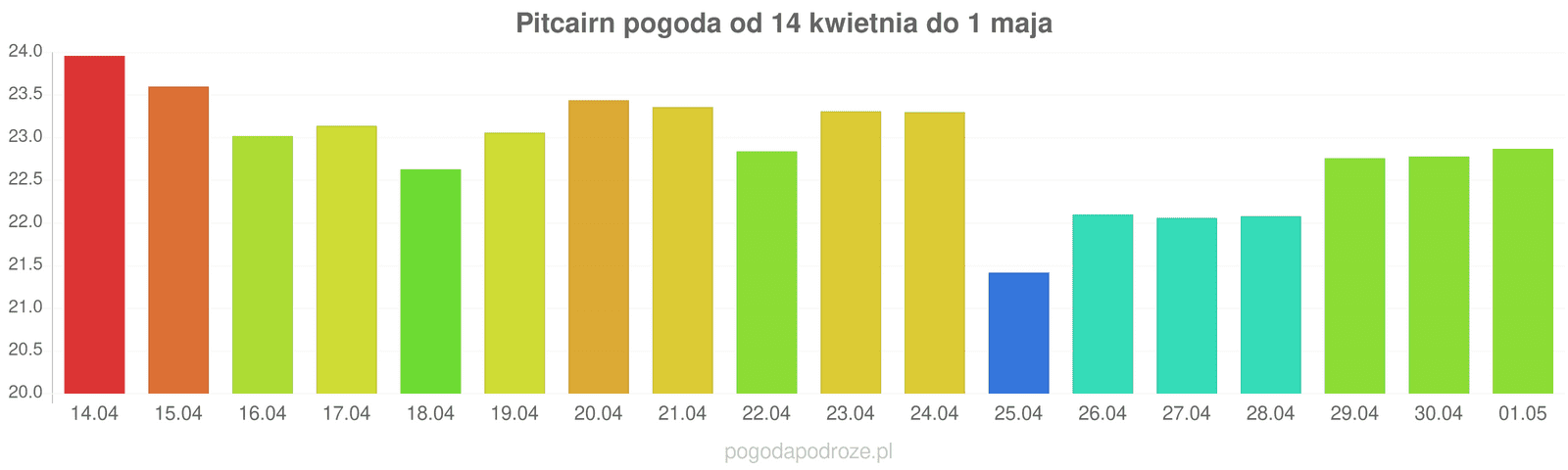 Według prognozy długoterminowej za tydzień w Pitcairn temperatura wzrośnie i będzie trochę cieplej, w ciągu dnia termometry bedą notowały około 23 stopnie.