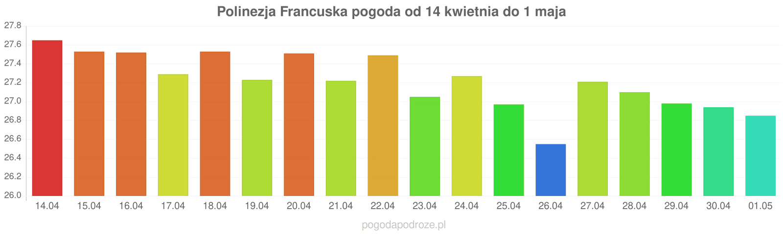 Jeśli damy wiarę prognozom z odstępem czasu 7 dni to czeka nas ochłodzenie w Polinezji Francuskiej w przyszłym tygodniu. Temperatura w ciągu dnia powinna spaść do 27 stopni.