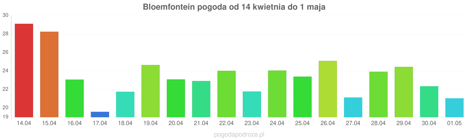 Według prognozy długoterminowej za tydzień w Bloemfontein temperatura będzie spadać, w ciągu dnia można będzie obserwować temperatury około 22 stopnie.