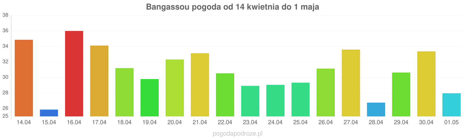 Jeśli damy wiarę prognozom z odstępem czasu 7 dni to czeka nas ochłodzenie w Bangassou w przyszłym tygodniu. Temperatura w ciągu dnia powinna spaść do 29 stopni.
