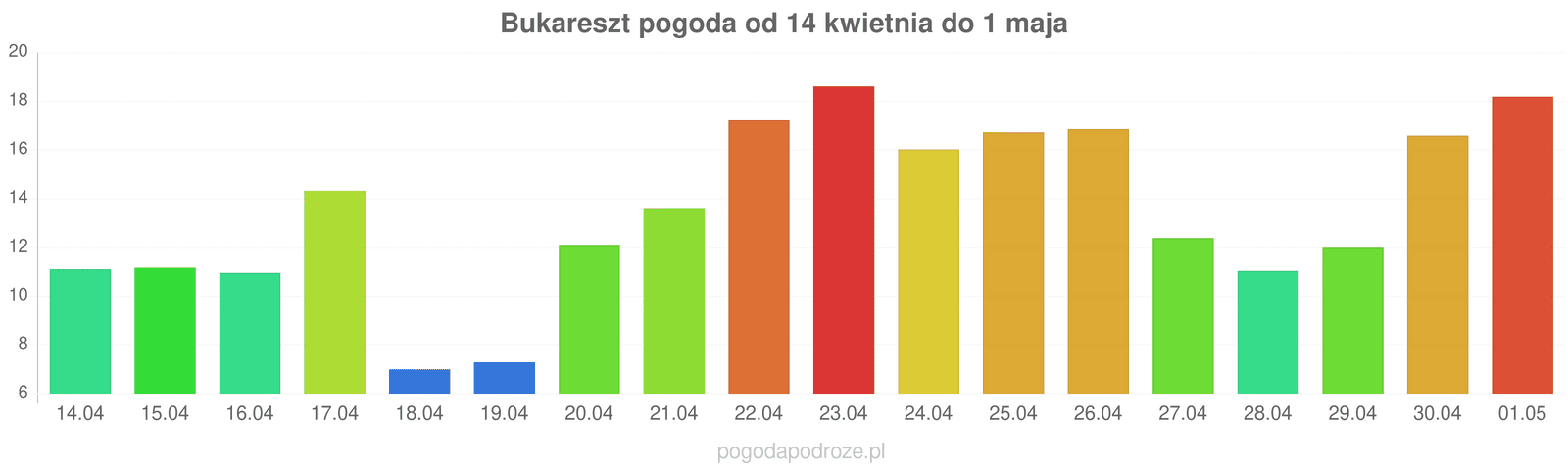 W nocy: 15℃Nad ranem: 11℃Wieczorem: 20℃mały deszczykCiśnienie: 1020Wilgotność: 56%Wiatr: 7Zachmurzenie: 44%
