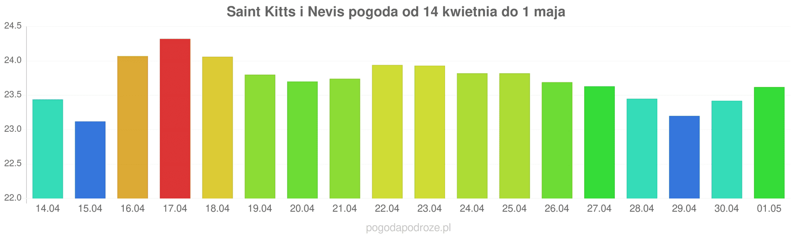 Według prognozy długoterminowej za tydzień na Saint Kitts i Nevis temperatura będzie spadać, w ciągu dnia można będzie obserwować temperatury około 24 stopnie.