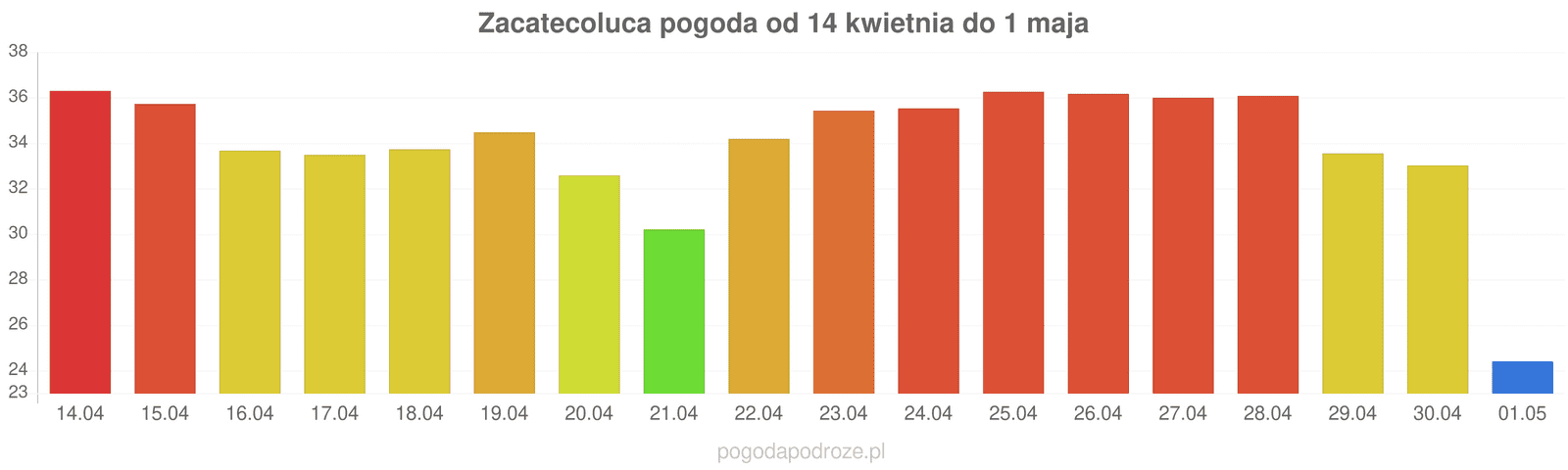 Jeśli wierzyć prognozom z odstępem czasu 7 dni to czeka nas dużo ciepła w Zacatecoluca w przyszłym tygodniu. Temperatura w ciągu dnia osiągnie 35 stopni.