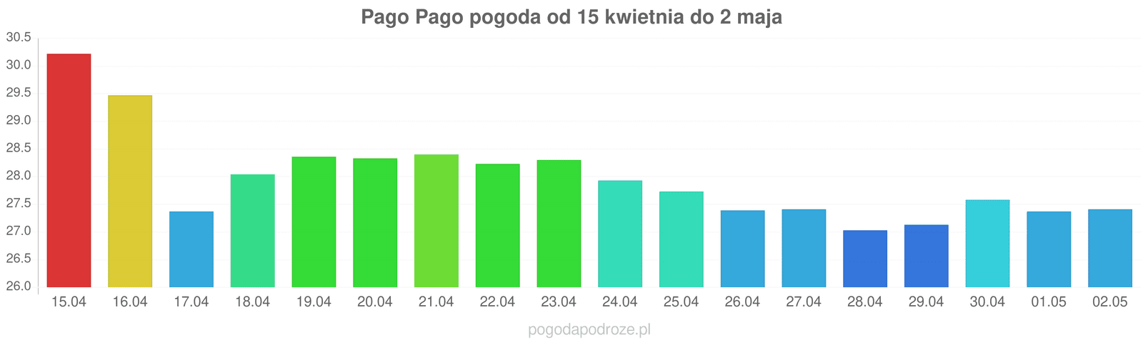 W przypadku dnia jutrzejszego można mówić o spadku temperatury w Pago Pago. Słupek termometry spadnie i wyniesie w ciągu dnia 27 stopni.