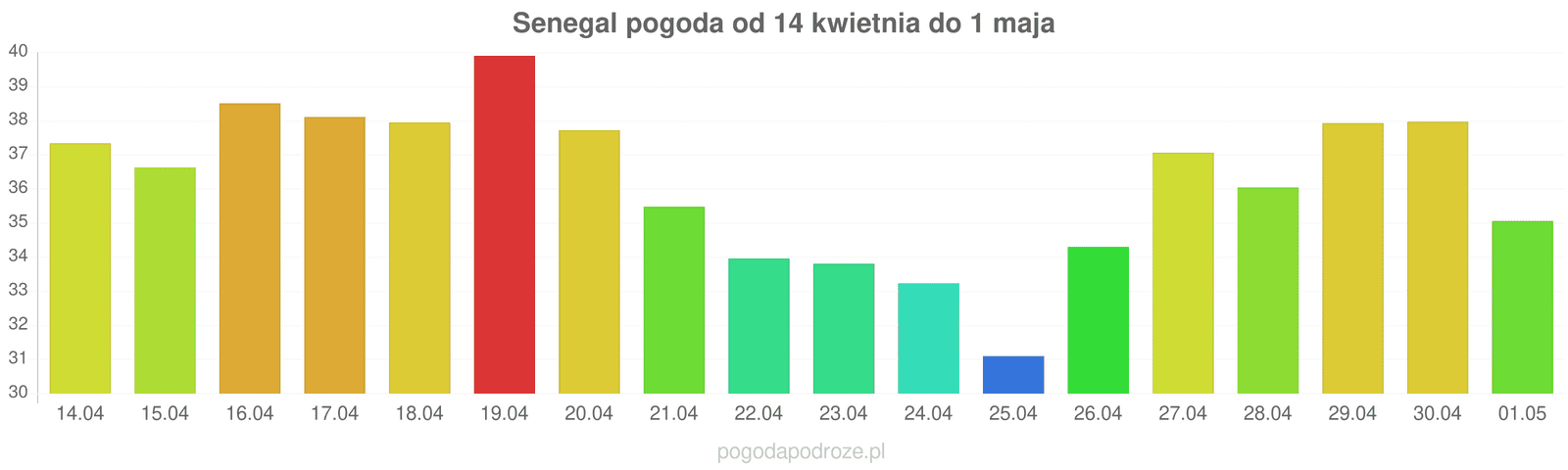 Jeśli damy wiarę prognozom z odstępem czasu 7 dni to czeka nas ochłodzenie w Senegalu w przyszłym tygodniu. Temperatura w ciągu dnia powinna spaść do 34 stopni.