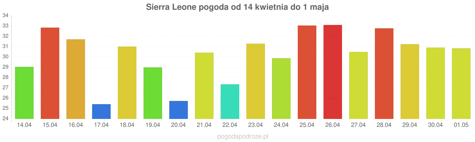 Jeśli damy wiarę prognozom z odstępem czasu 7 dni to czeka nas ochłodzenie w Sierra Leone w przyszłym tygodniu. Temperatura w ciągu dnia powinna spaść do 31 stopni.