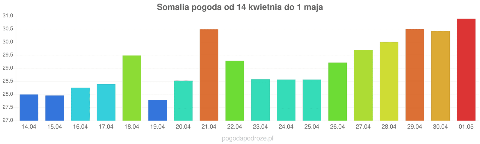 Jeśli wierzyć prognozom z odstępem czasu 7 dni to czeka nas dużo ciepła w Somalia w przyszłym tygodniu. Temperatura w ciągu dnia osiągnie 29 stopni.