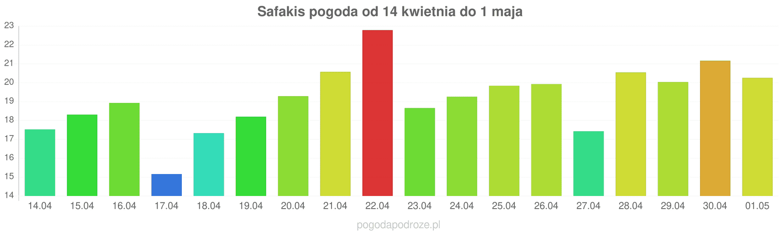 W nocy: 19℃Nad ranem: 14℃Wieczorem: 20℃słonecznieCiśnienie: 1015Wilgotność: 35%Wiatr: 9