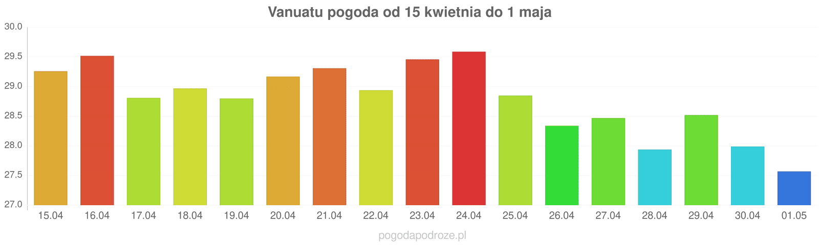 Jeśli damy wiarę prognozom z odstępem czasu 7 dni to czeka nas ochłodzenie na Vanuatu w przyszłym tygodniu. Temperatura w ciągu dnia powinna spaść do 29 stopni.