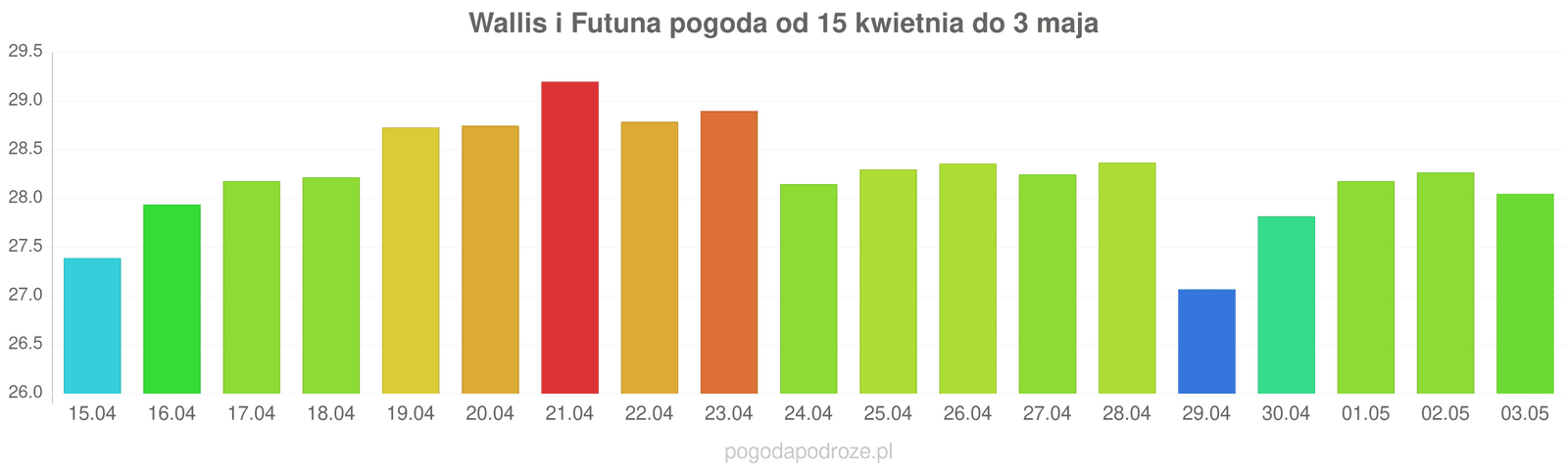Jeśli wierzyć prognozom z odstępem czasu 7 dni to czeka nas dużo ciepła w Wallis i Futuna w przyszłym tygodniu. Temperatura w ciągu dnia osiągnie 29 stopni.