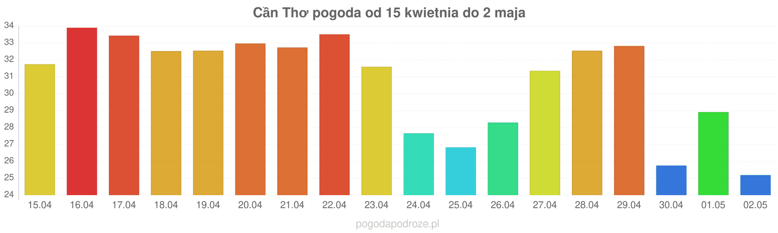 Jeśli damy wiarę prognozom z odstępem czasu 7 dni to czeka nas ochłodzenie w Cần Thơ w przyszłym tygodniu. Temperatura w ciągu dnia powinna spaść do 32 stopni.