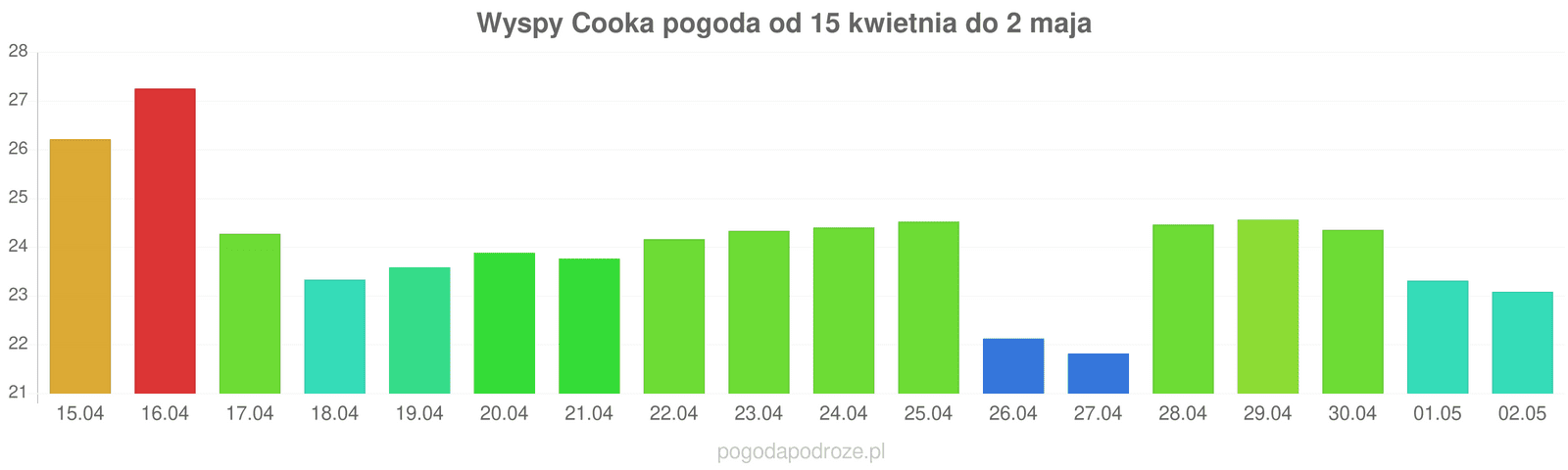 Jeśli damy wiarę prognozom z odstępem czasu 7 dni to czeka nas ochłodzenie w Wyspach Cooka w przyszłym tygodniu. Temperatura w ciągu dnia powinna spaść do 24 stopni.