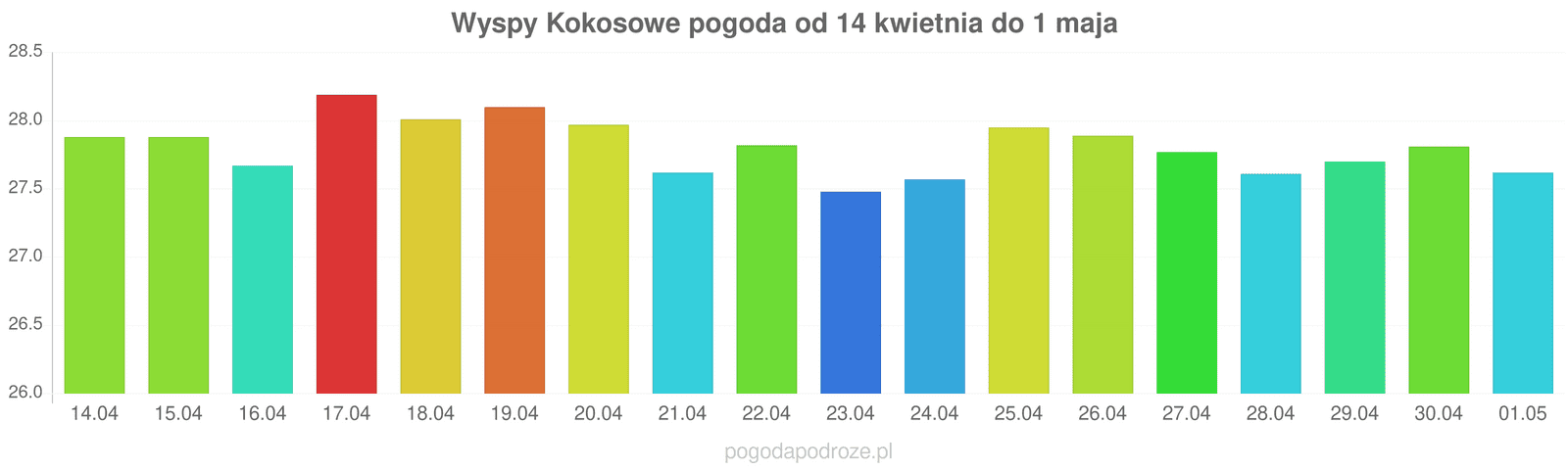 Z kolei jutro będzie jeszcze cieplej niż dziś na Wyspy Kokosowe. Termometry pokażą w ciągu dnia 28 stopni.