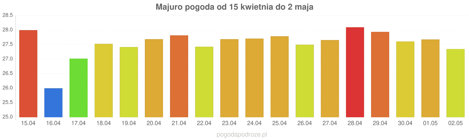 Z kolei jutro będzie jeszcze cieplej niż dziś w Majuro. Termometry pokażą w ciągu dnia 27 stopni.